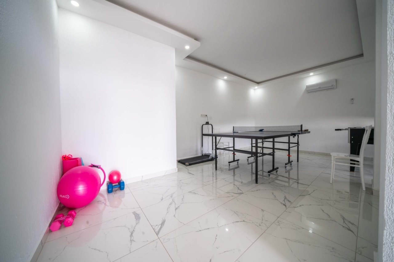NOT : Villamızda yer alan spor odası alt katta yer almaktadır. Havuz terasındaki merdivenden aşağı inerek giriş yapılmaktadır. Bu kısımda bahçe de bulunmakta olup çocuk oyun parkımız da mevcuttur. Villamızın alt katında Villa Spring 2 yer almaktadır. Villaların havuzları, bahçeleri ve girişleri birbirinden bağımsızdır. Villalarımızın takvimi müsait olduğu takdirde ikisini aynı anda kiralama imkanı bulunmaktadır. Spor odasını sadece Villa Spring 1 misafirleri kullanabilmektedir.